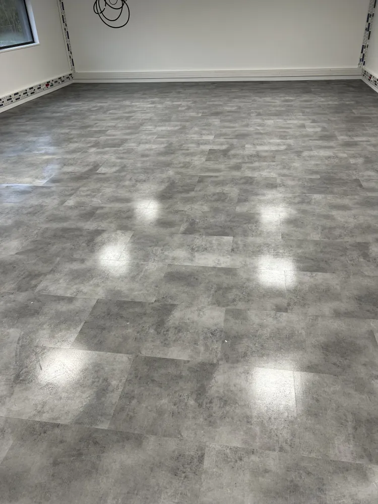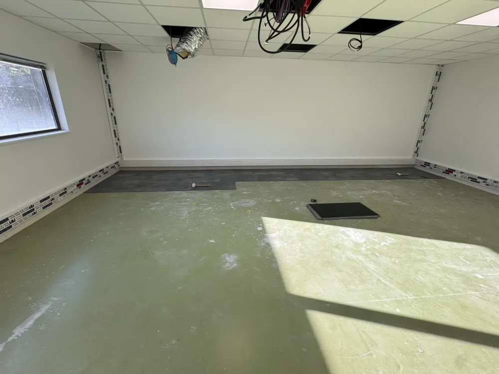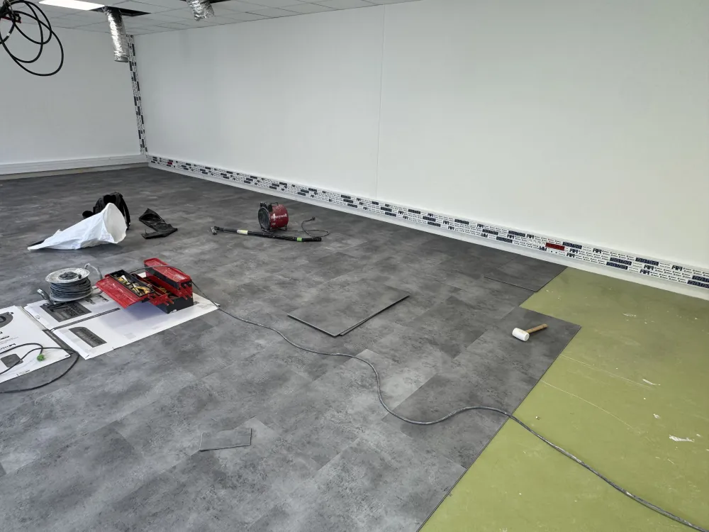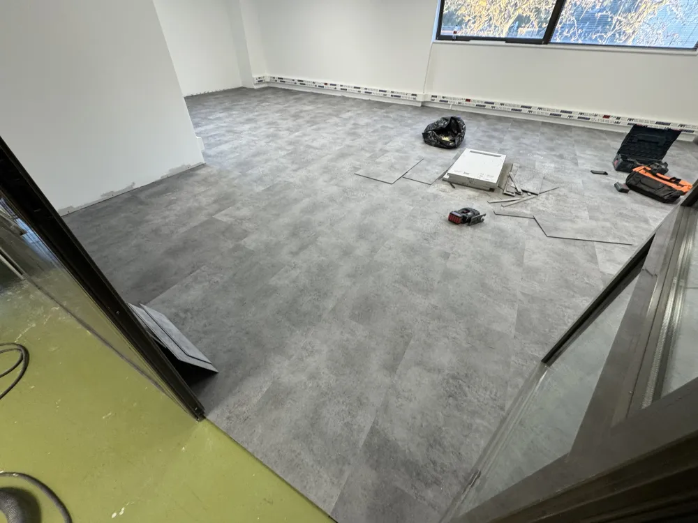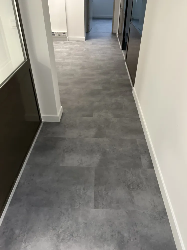 Rénovation des sols en dalles souples PVC Modulaire à clipser en 70 mm, idéal pour toutes zones de grand trafic piéton, dans ce cas précis, différents espaces de travail dans le projet de réaménagement et redistribution de bureaux au Tholonet.