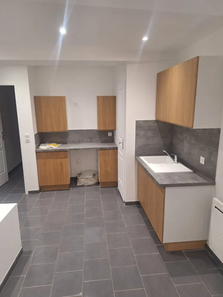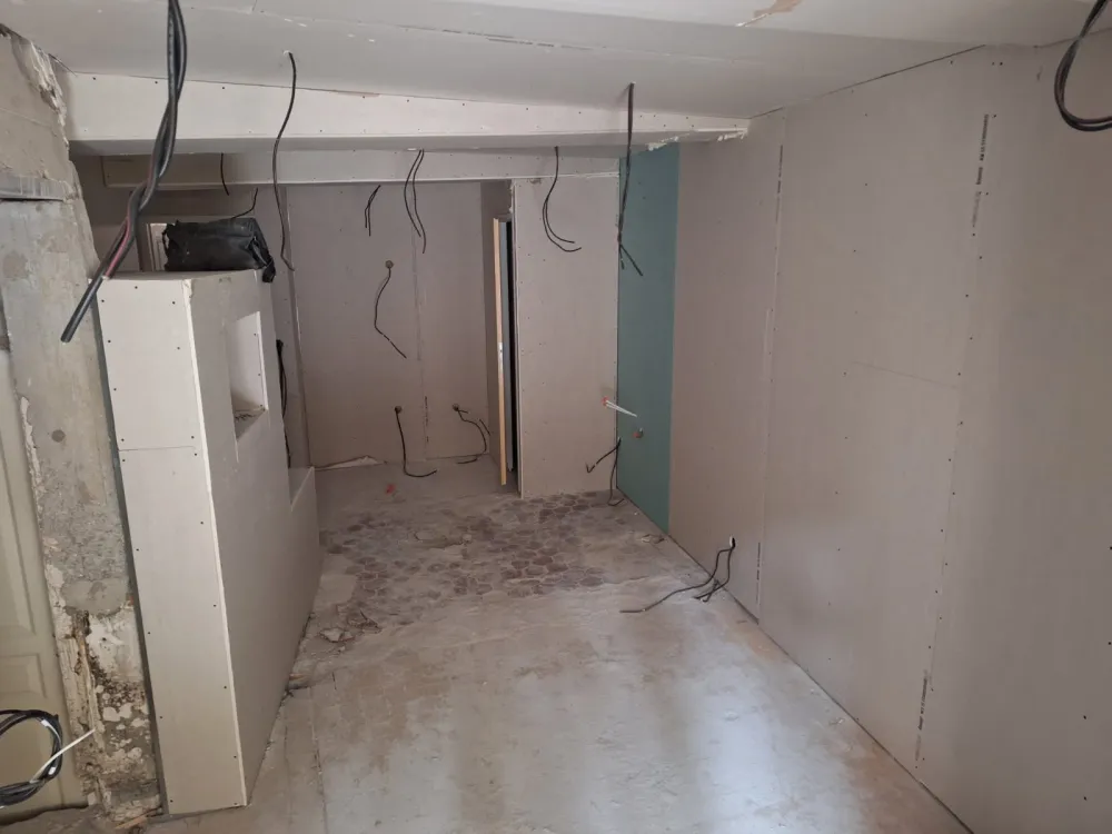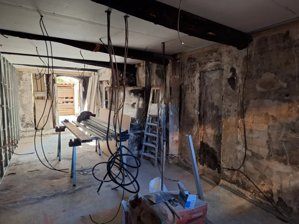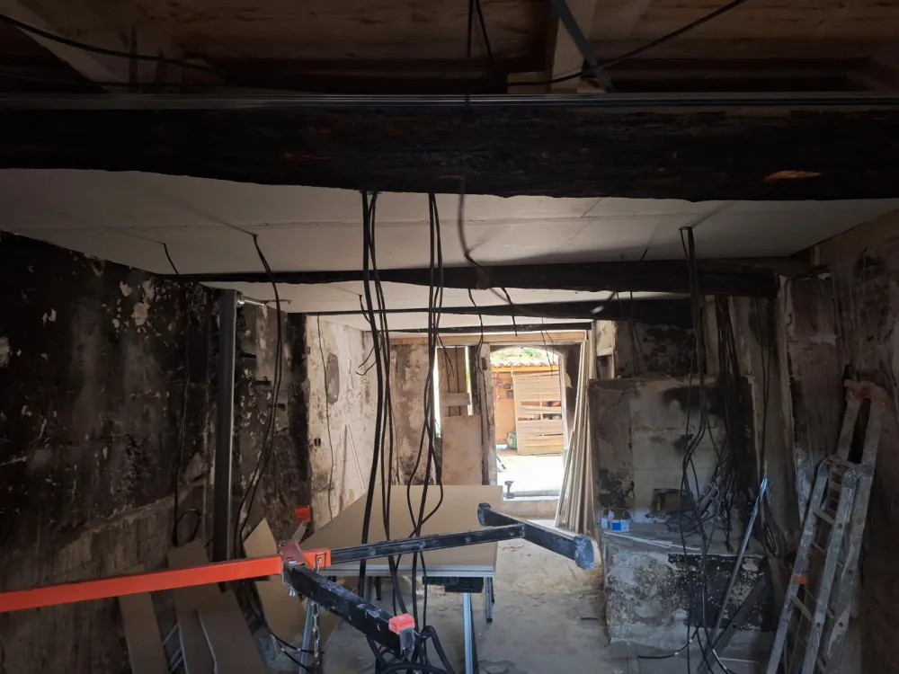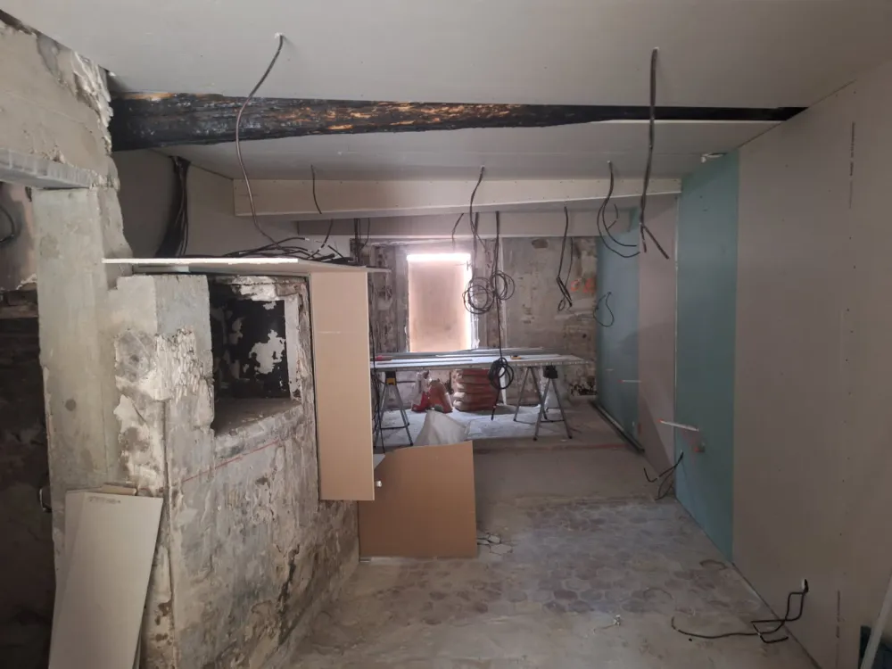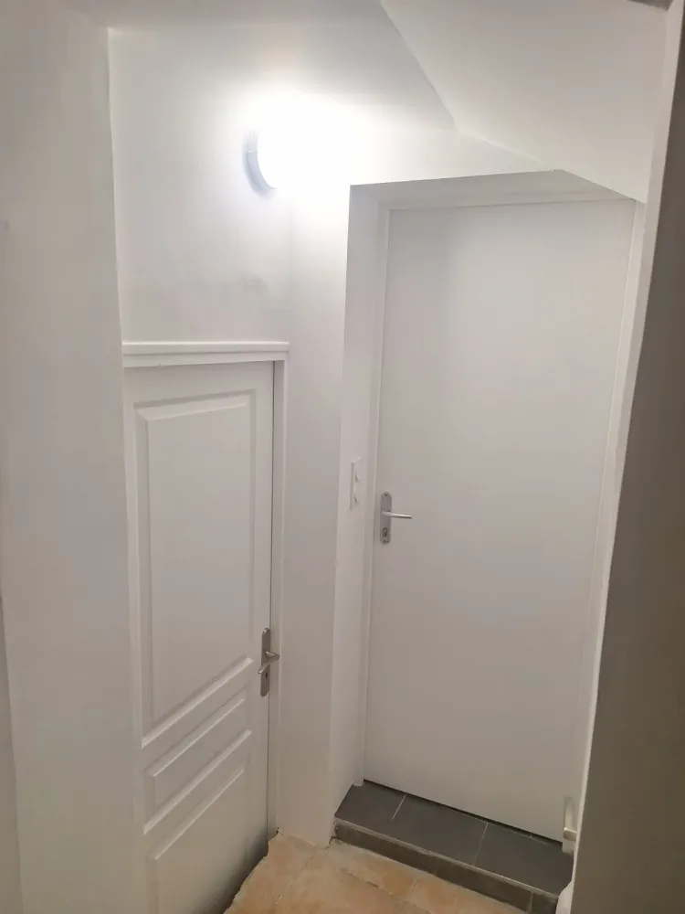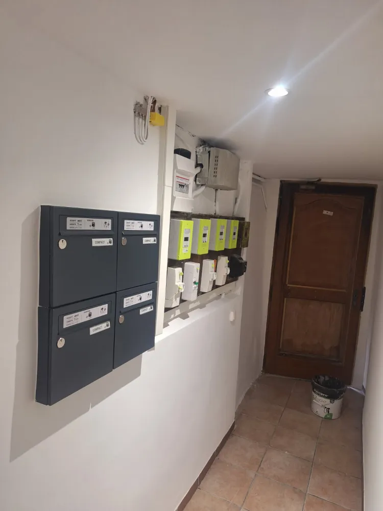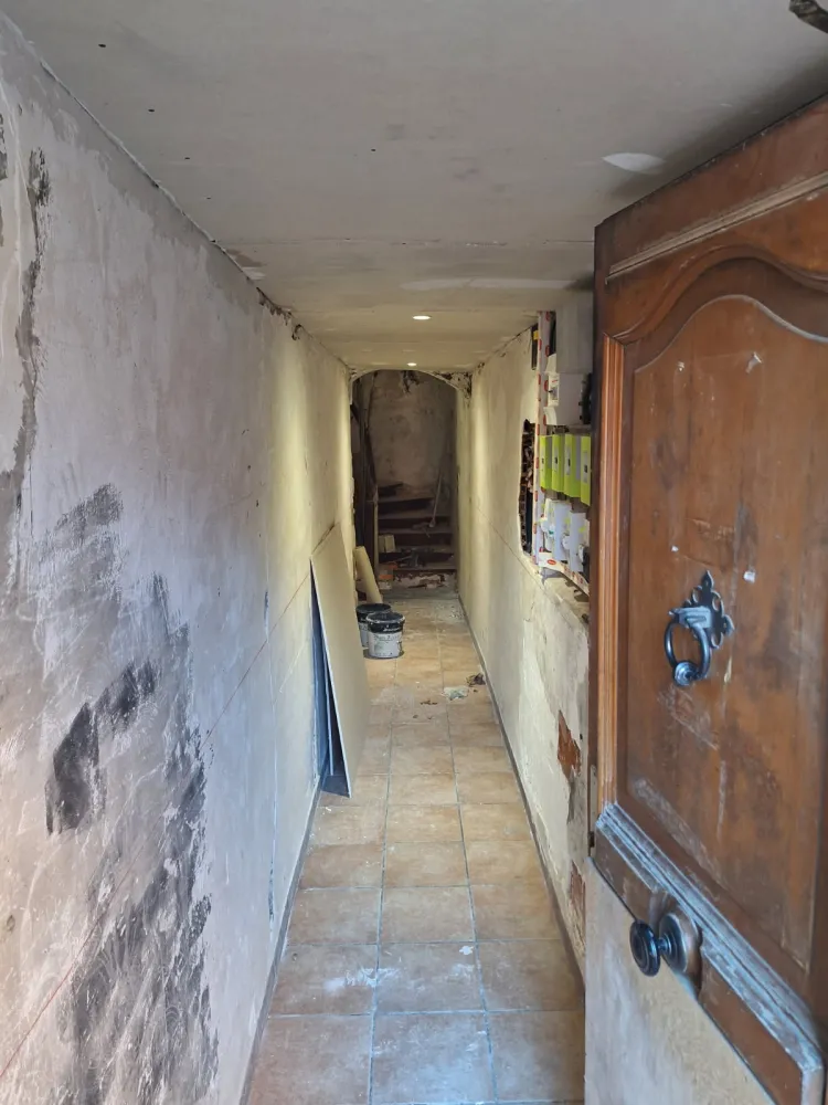 Restauration d'un hall d'entrée en partie commune et d'un appartement suite à un incendie, comprenant la création de cloison, de contre-cloisons et de faux plafonds en feuilles de placoplâtre standards et hydrofuges avec isolation thermique en rouleau de laine de verre, sur ossature métallique. Mise en peinture des faux plafonds, des murs et des portes.