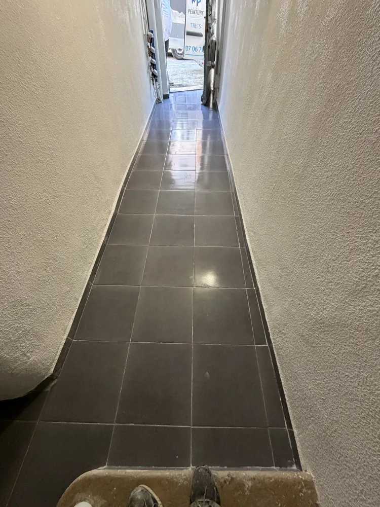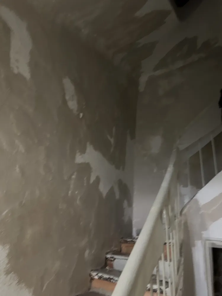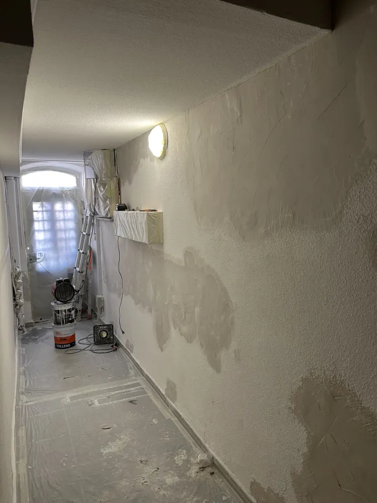 Décroutage des murs, impression générale, mise en enduit des parties dégradées et finition avec de la gouttelette ( crépi intérieur ).