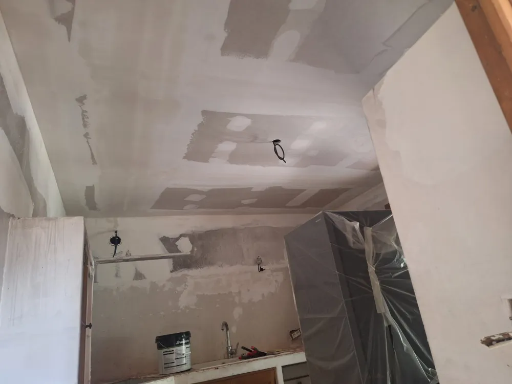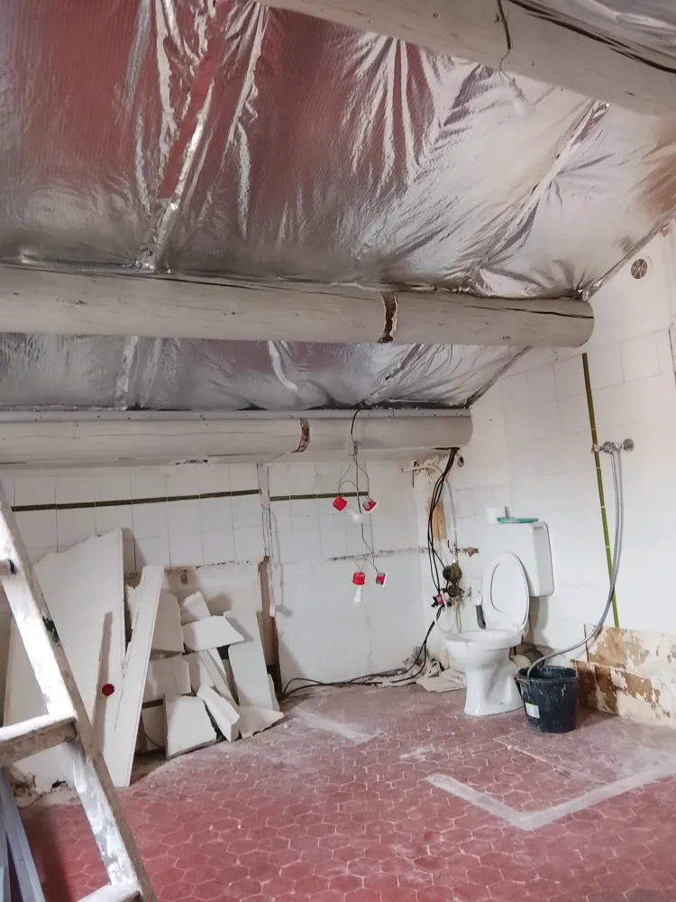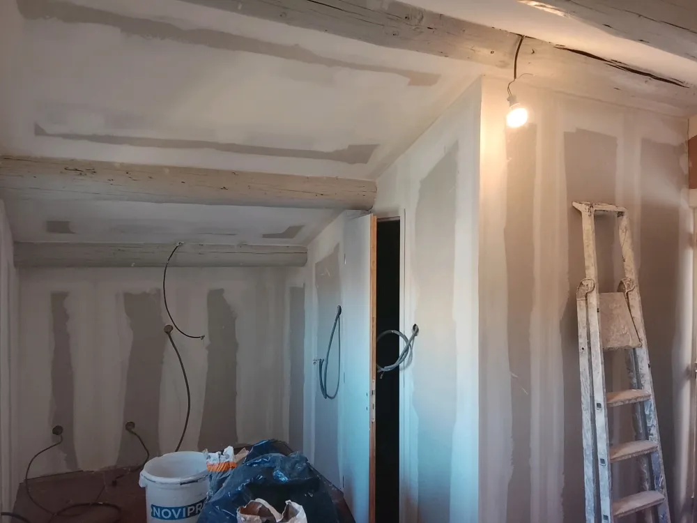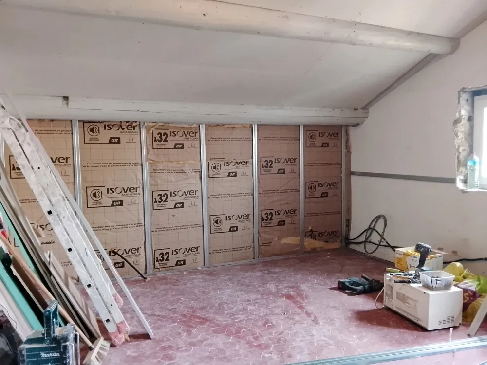 Travaux de rénovation comprenant la création d'un faux plafond en placoplâtre avec une isolation thermique ( utilisation d'un isolant mince ), de contre-cloisons sur les murs périphériques du studio, la démolition de cloisons ( ancienne SDB ), création de nouvelles cloisons, jointoiement des bandes sur l'ensemble des plaques de plâtre, puis mise en peinture de teinte blanche finition mat.