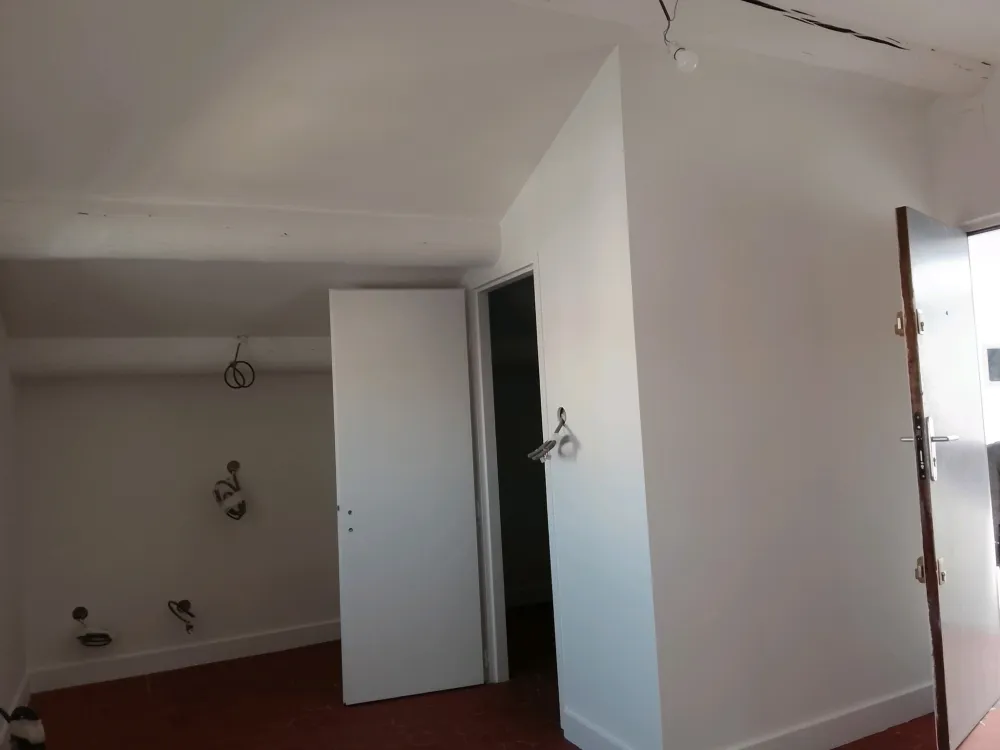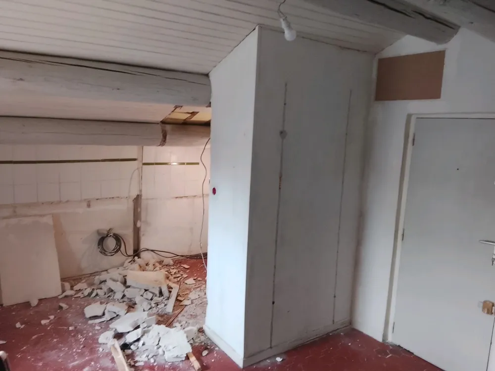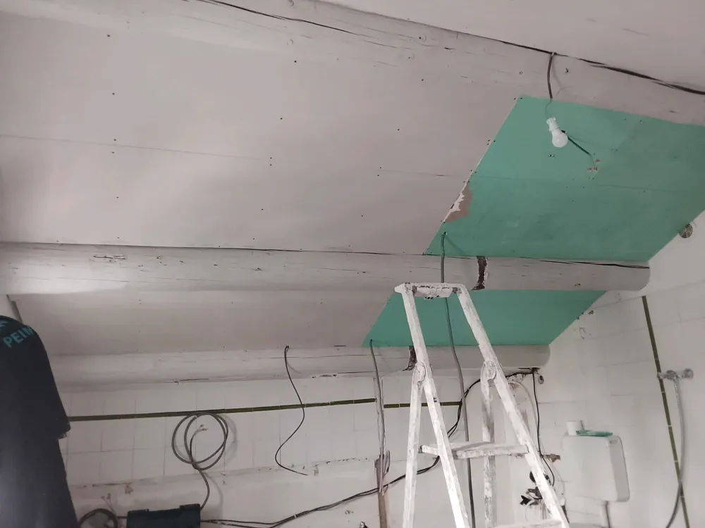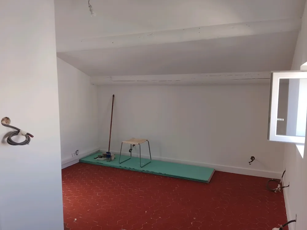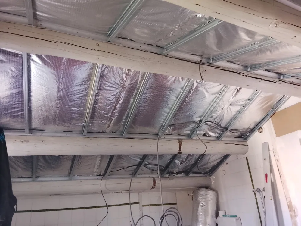 Travaux de rénovation comprenant la création d'un faux plafond en placoplâtre avec une isolation thermique ( utilisation d'un isolant mince ), de contre-cloisons sur les murs périphériques du studio, la démolition de cloisons ( ancienne SDB ), création de nouvelles cloisons, jointoiement des bandes sur l'ensemble des plaques de plâtre, puis mise en peinture de teinte blanche finition mat.