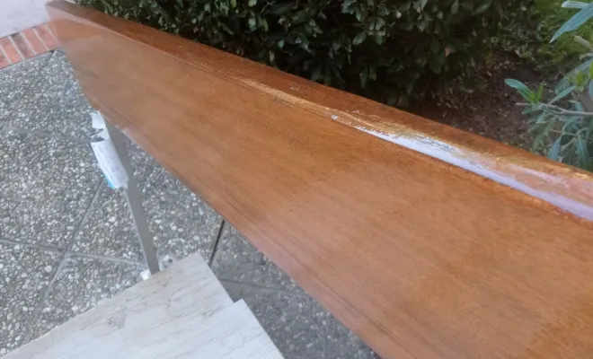 Rénovation de rampes en bois par ponçage et reprise de teinte en lasure et vernis, travaux effectués sur Aix-en-Provence dans une copropriété.
