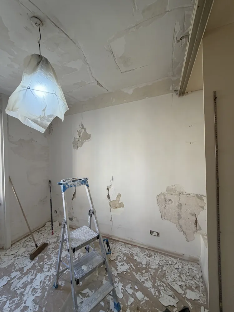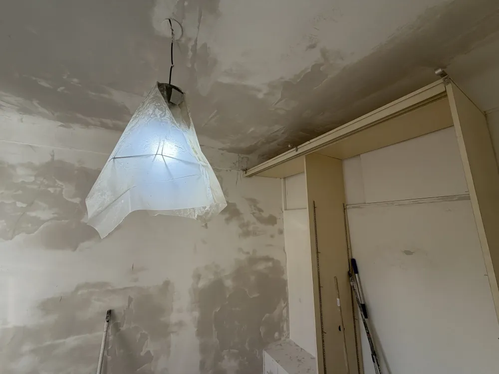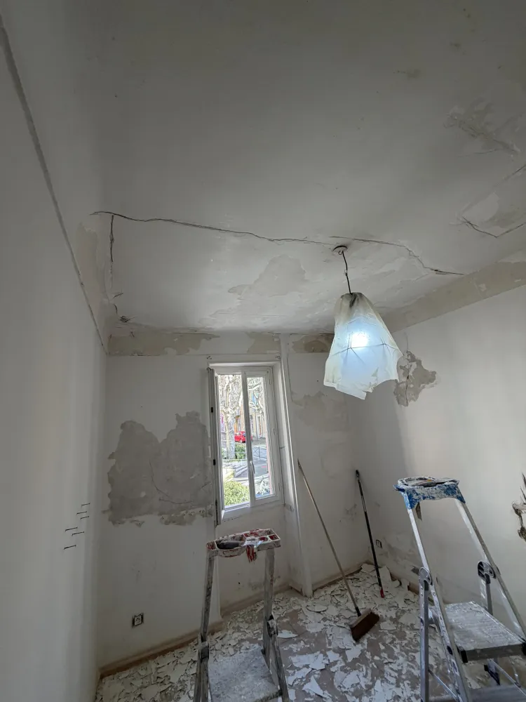 Traitement de plusieurs fissures assez conséquentes dans une chambre avec fixation du support, pose d'une trame de rénovation, ratissage en enduit fibré et mise en peinture du plafond et des murs en finition mat.