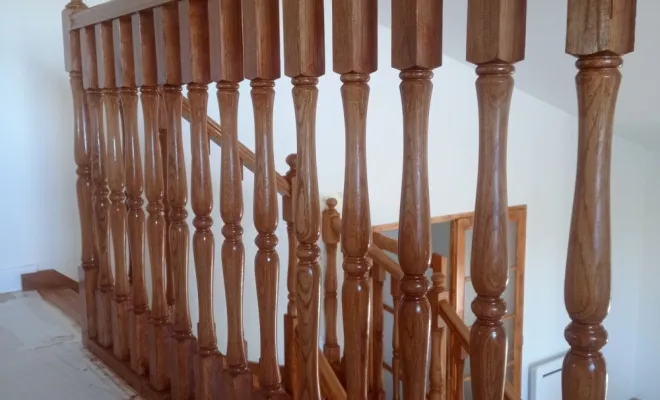 Application d'un vernis vitrificateur teinté sur un escalier avec ses rampes et mains courantes.