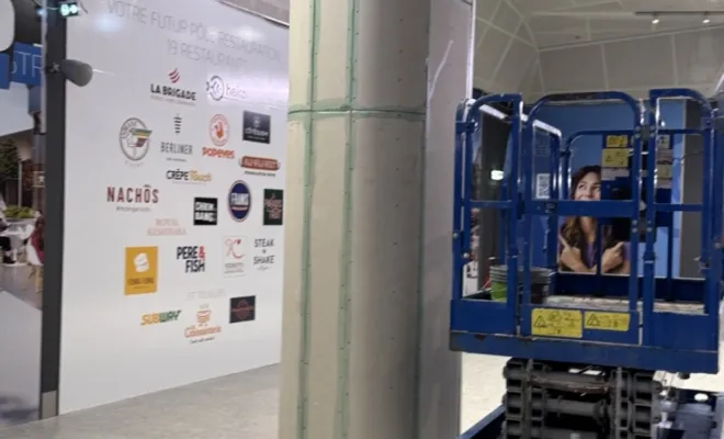 Mise au goût du jour de plusieurs piliers ornementaux dans la galerie marchande du centre commercial Barnéoud Plan-de-Campagne, avec la mise en place de cloison courbe de chez SINIAT, procédé innovant permettant la mise en place de cloisons arrondies en placoplâtre.